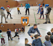 So trafen die Grundschüler/innen auf die Fechter der FSG. Susanne Weisgerber erklärte den Kindern am Anfang, worum es geht und was sie an diesem Tag erfahren und lernen werden. Zum Aufwärmen durften die Kinder zuerst einige Minuten mit einem Softball spielen. Danach machten sie mit Susanne Lauf- und Lockerungsübungen.